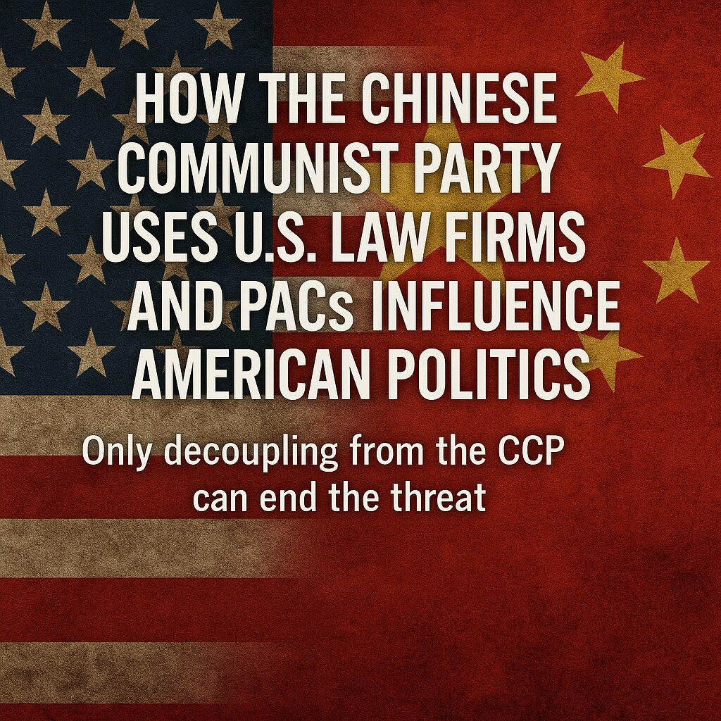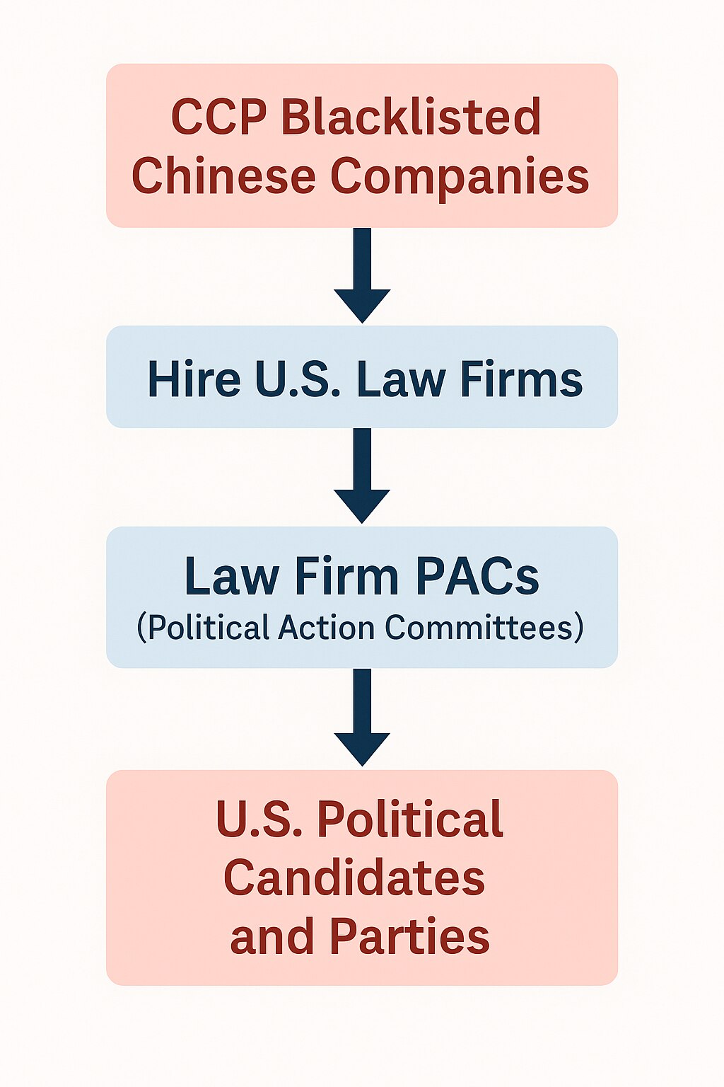 The Chinese Communist Party (CCP) is increasingly using America’s legal lobbying system and political donation infrastructure to shape U.S. policy and political dynamics. Based entirely on open-source data, this article exposes a traceable chain of influence—from CCP-blacklisted companies, to the U.S. law firms that represent them, to the PACs those firms operate, and finally to the U.S. politicians who receive their support.