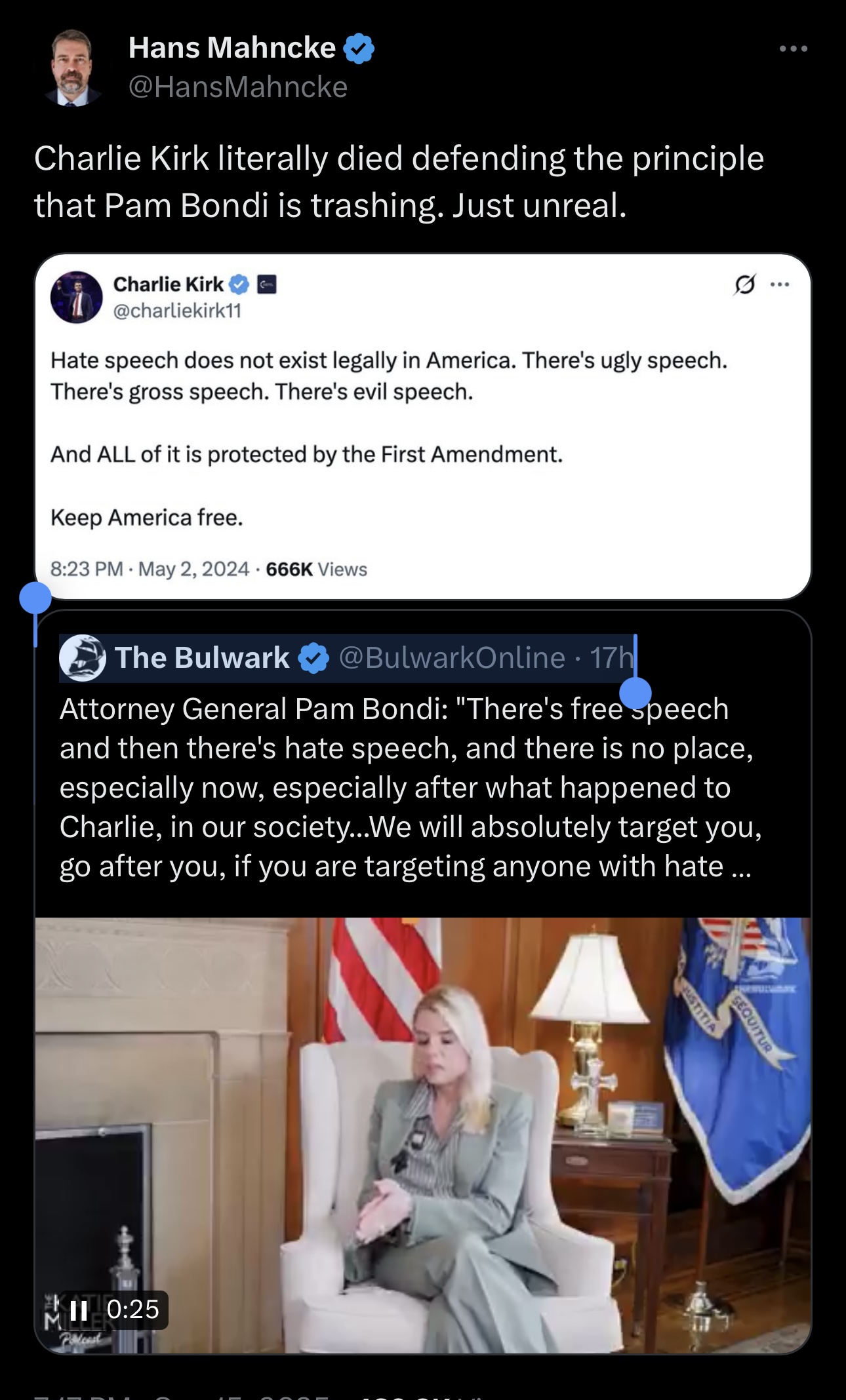In her statement, the Attorney General Pam Bondi divided speech into free speech and hate speech, claiming broadly that “hate speech has no place in society.”